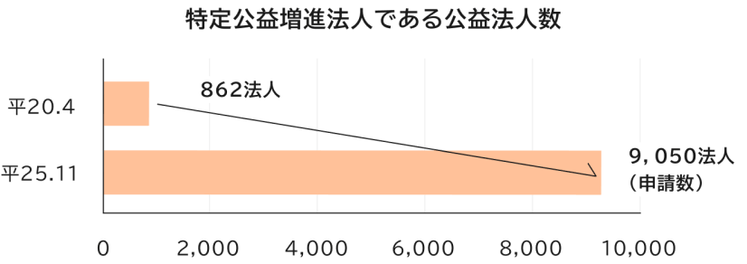 旧公益法人のうち、寄附の税制優遇の対象となる「特定公益増進法人」は、862法人でした(平成20 年4月時点)。これに対し、新たな公益認定基準を満たした新公益法人は全て「特定公益増進法人」と なりますので、制度改革前の10倍以上の増加となっています。